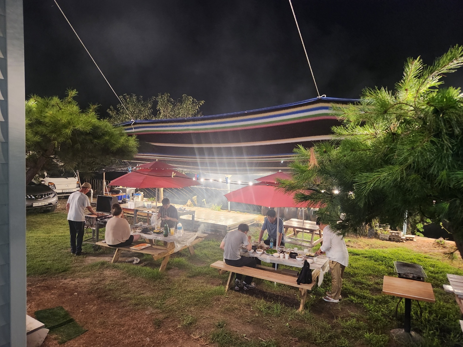 서포리 스카이뷰펜션의 잔디밭 바베큐장에서 저녁 식사를 했어요.